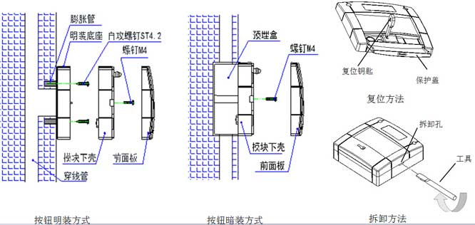 上圖為消火栓按鈕的安裝方式,分別有安裝方式和明裝方式兩種。